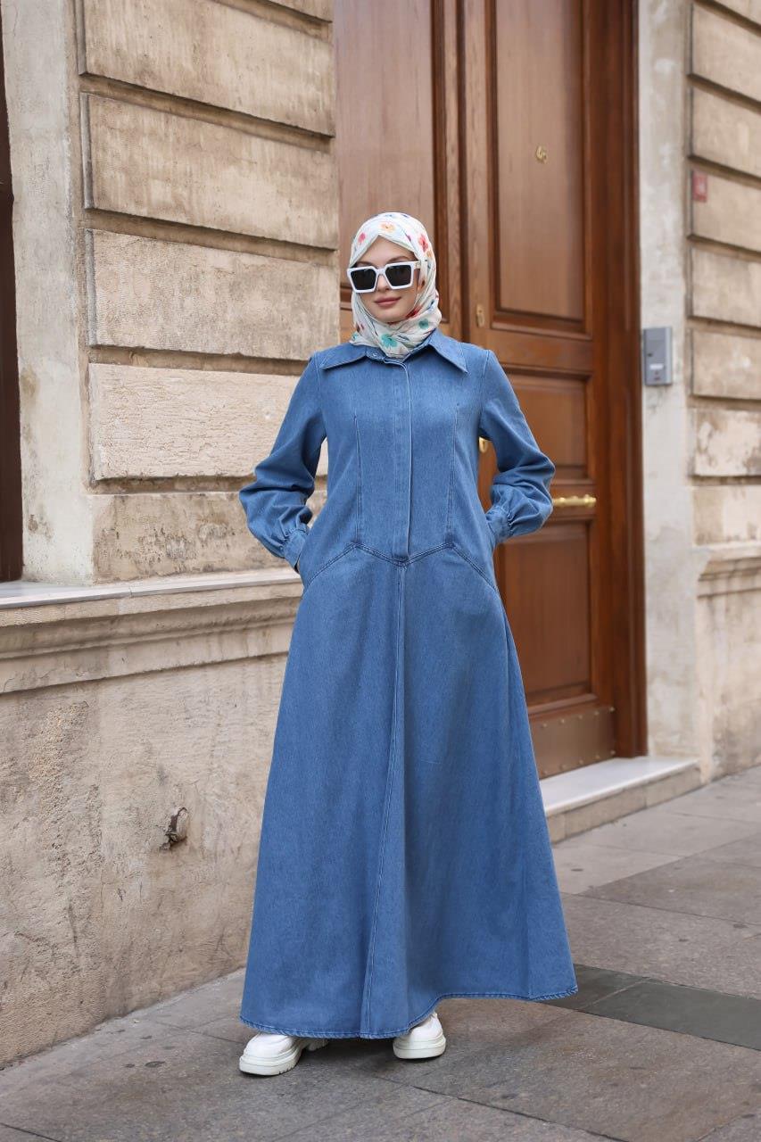 1586 Çıtçıtlı Kot Elbise - Açık Kot