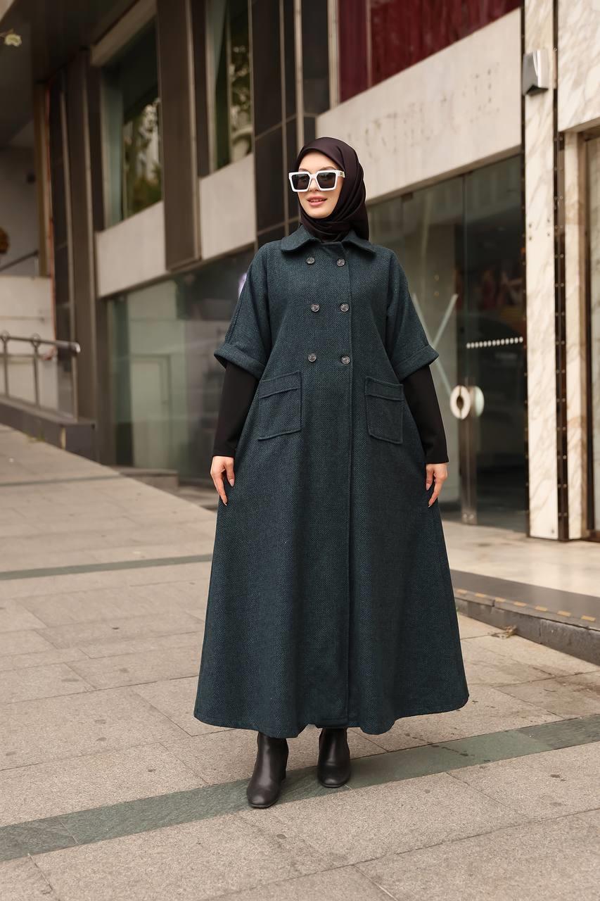 Üzerine panço ile kombine olmuştur. Düğme detaylarına sahip panço kaşe kumaş olup kış günleri sizi sıcak tutacaktır.