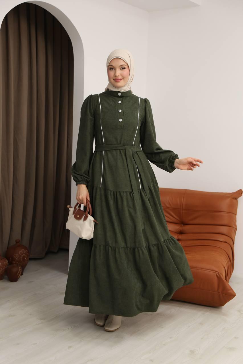 Şık ve açılabilir düğme detaylarına sahip, manşetleri lastikli, belsiz tasarımlı kışlık elbise.