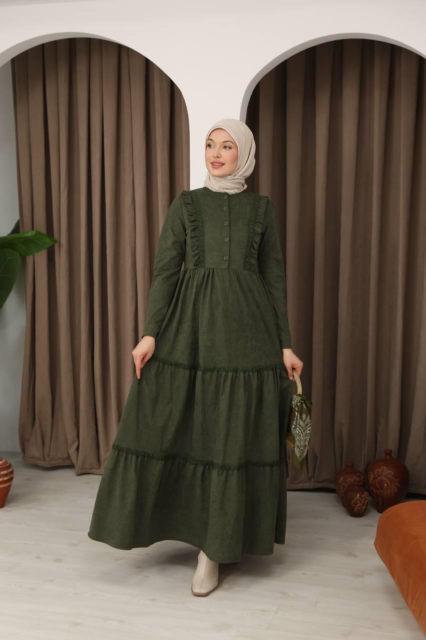 8034 Güpürlü Fırfırlı Elbise - Haki