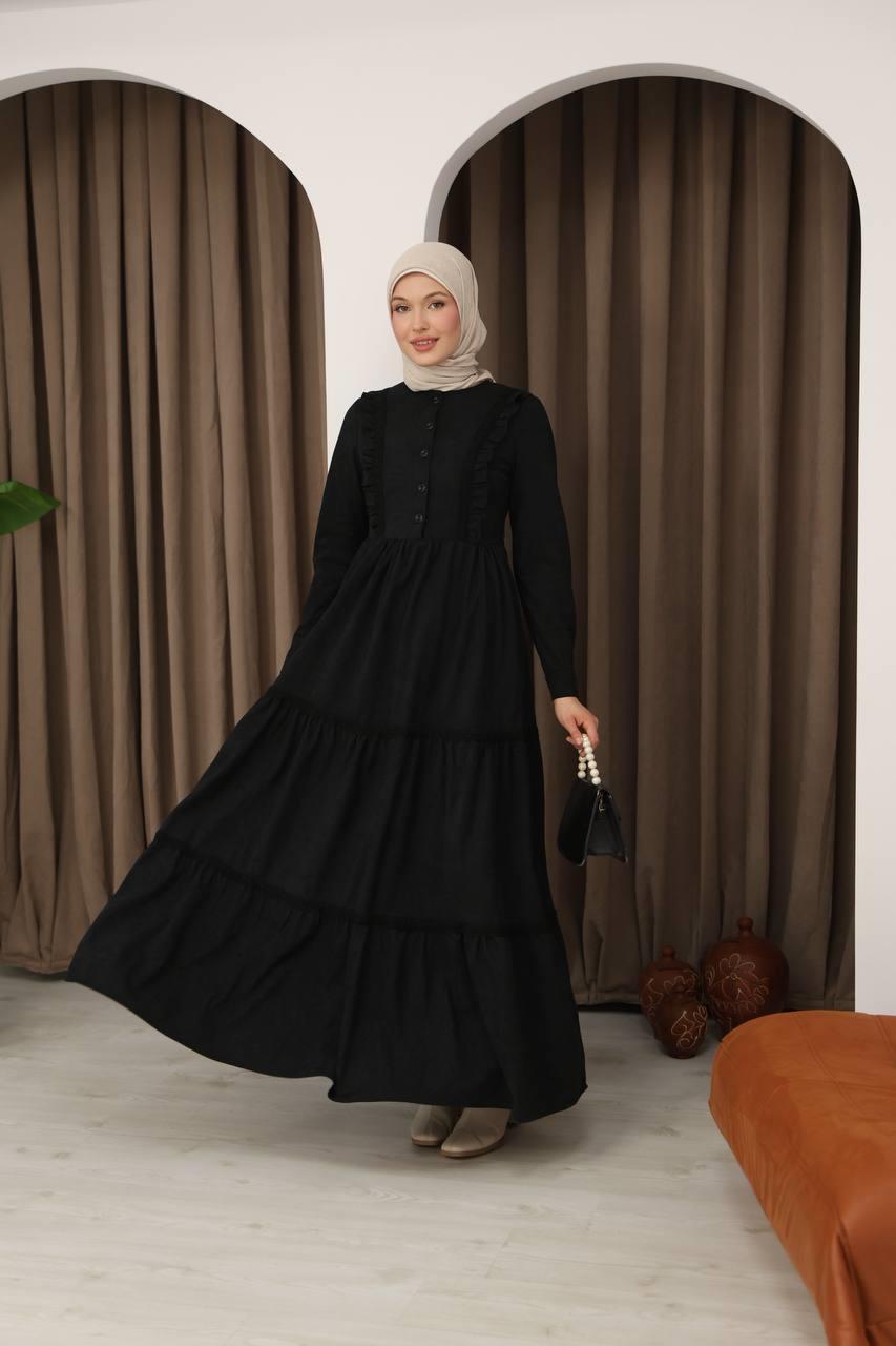 8034 Güpürlü Fırfırlı Elbise - Siyah